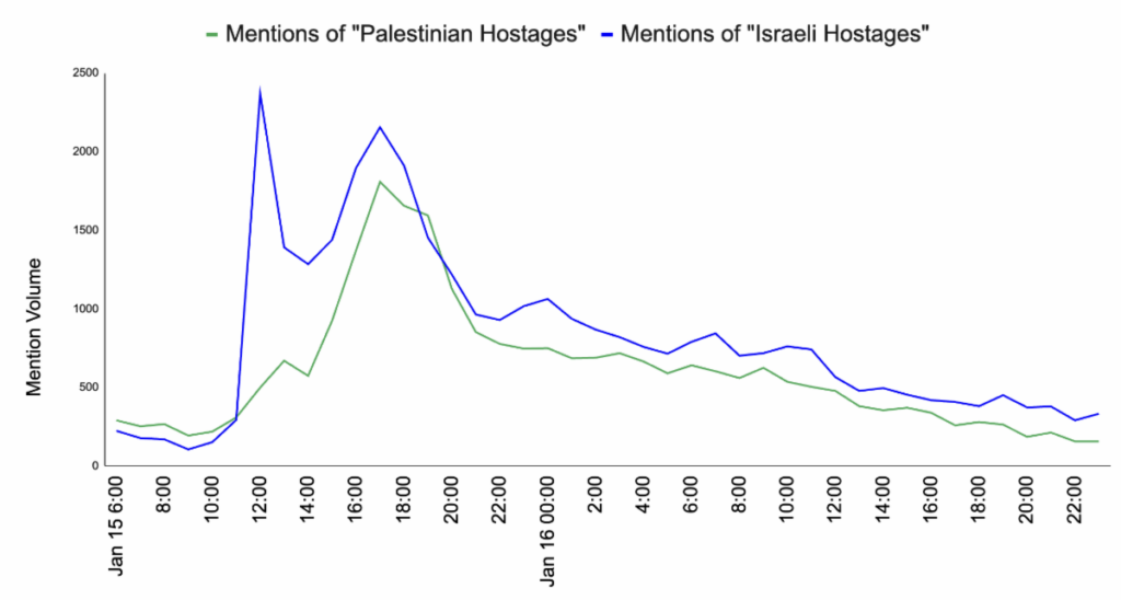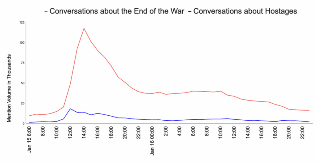 The announcement of the agreement led to a 148% increase in social media conversation compared to the average, but the nature of that conversation felt like two different universes. Many celebrated the imminent release of hostages. However, posts about the return of the hostages accounted for only 10% of all posts related to the ceasefire since Wednesday.