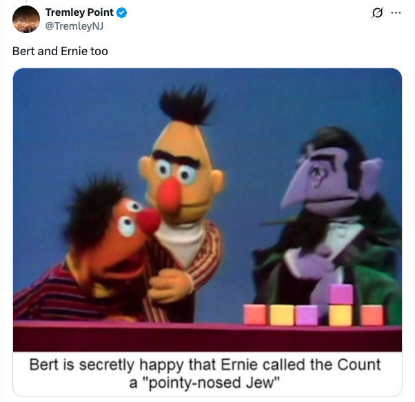 Meanwhile, Count von Count—the vampire-themed mathematician—has been reimagined on social media as a Jewish caricature, drawing on tropes about blood libel, parasitism, and his oversized nose that have been used to dehumanize Jews for centuries.