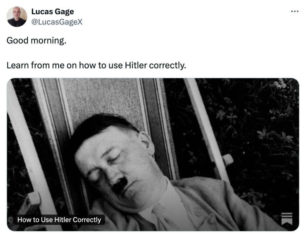 Additionally, Lucas Gage, who has previously been banned from X for posting a video of himself burning the Talmud, a sacred Jewish book, took the advantage of the chatter to promote his newsletter, enticing people with the caption “learn from me how to use Hitler correctly.”