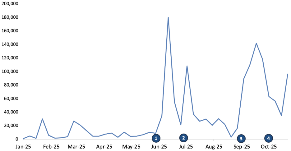 Political influencers and podcasters are increasingly promoting antisemitic conspiracy theories and amplifying extreme online conversations. In recent months, Tucker Carlson, a prominent American commentator, has featured guests for discussions that have drawn large online reactions related to antisemitism. Since June 2025, Carlson’s name has appeared 1.5 million times in our Command Center which tracks online conversations about Jewish culture and antisemitism—a 690% increase since June. This increase aligns with moments when Carlson’s interviews or comments became part of wider online conversations where antisemitic narratives appeared.