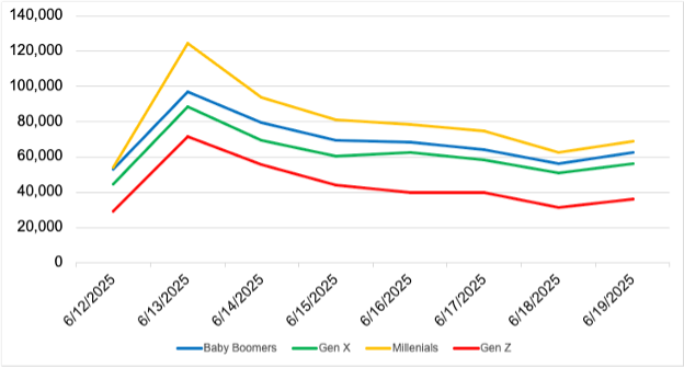 Online conversations surrounding the recent escalation between Israel and Iran saw significant generational differences in both volume and tone. There was a sharp spike in activity across all age groups between June 12th and 13th, coinciding with Israel’s preemptive strike and Iran’s subsequent rocket retaliation.  As shown in the graph below, Millennials were the most active participants in these discussions, followed closely by Baby Boomers and Gen X. Gen Z users engaged the least.