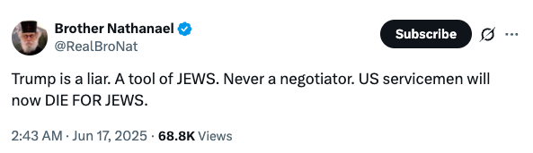 Antisemitic conspiracy theories have risen notably in social media conversations since the start of escalations between Israel and Iran. Many of these narratives frame Jewish people or Israel as central instigators of global conflict, with posts claiming Jewish people are dragging the world to World War III. Since June 12th, mentions of “World War III” within monitored search terms related to antisemitism, Jewish culture, and Israel have increased 1,770%.