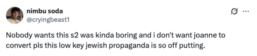 The show’s second season has faced a surge of antisemitic backlash online. Comments have ranged from claims that the show is “Jewish propaganda” or examples of so-called “Zionist-washing.” Other users mocked it with remarks like having “Jew fatigue” or suggesting that Jewish storylines are part of a hidden agenda.