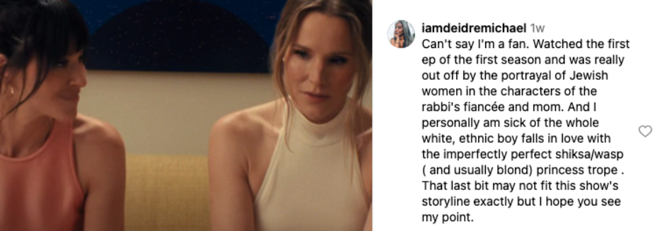 At the same time, many Jewish viewers have voiced mixed feelings. Some appreciate the representation and visibility, while others criticize the writing for recycling-tired stereotypes. One viewer wrote that they found the portrayals of Jewish women outdated and unfunny. Another said that while the show tries to move beyond stereotypes in its second season, it doesn’t go far enough. Others expressed frustration with recurring Hollywood tropes, such as the Jewish man paired with a non-Jewish woman, calling it clichéd and limiting. Another commenter added to the discussion, noting that the show’s depiction of Jewish practices is sometimes outright inaccurate, one scene features a rabbi discussing mourning Tu Bishvat, a joyful celebration of trees and nature.