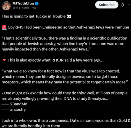 During the COVID-19 pandemic, these same prejudices re-emerged online in new forms. One theory, originally spread by Robert F. Kennedy Junior (RFK Jr.), suggested that the COVID-19 virus was “tailored” and had different effects on different populations. This 2023 report by the New York Post claimed that RFK Jr. said that COVID was “ethnically targeted to spare Jews.”