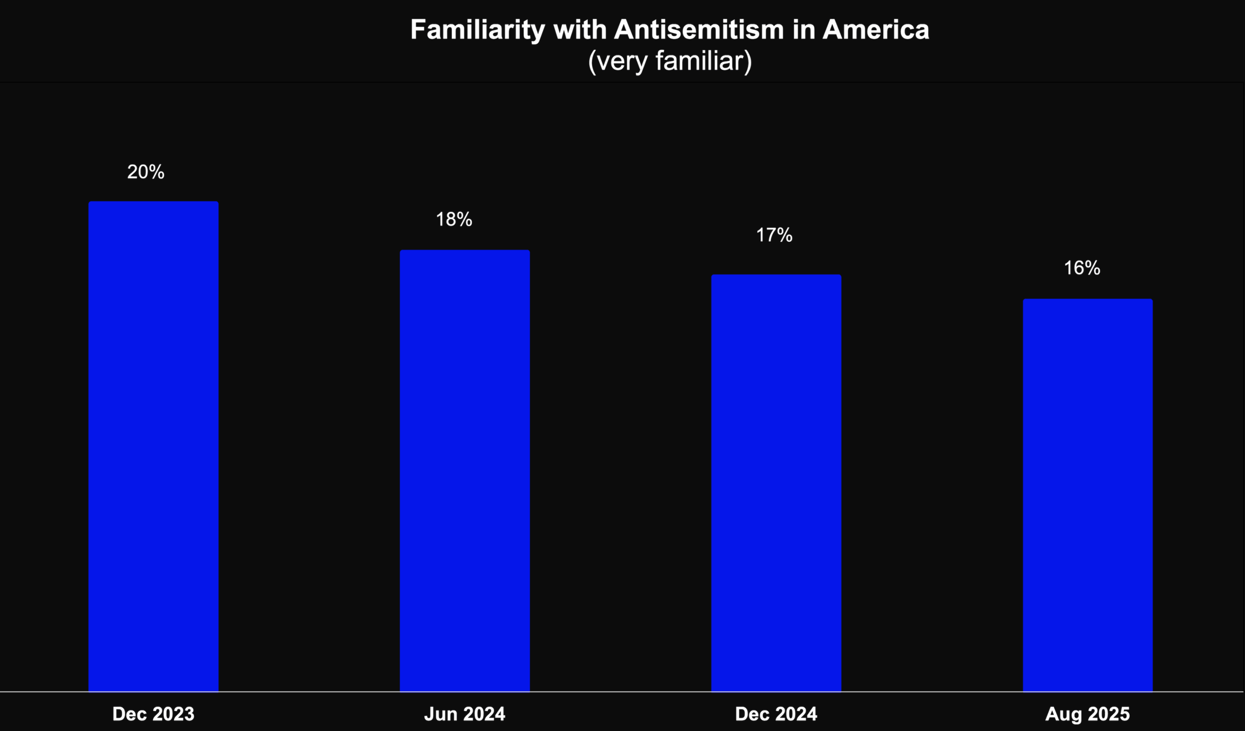 Fighting any injustice begins with baseline awareness of that injustice, and awareness of antisemitism is decreasing even as antisemitic incidents in this country are increasing. In our most recent survey (fielded in August and September), only 15% of US adults report they are very familiar with recent events in the US regarding prejudice against Jewish people. That number was 20% at the end of 2023. Similarly, only a minority of Americans are aware of historical prejudice against Jews, such as Jews once being banned from practicing medicine and law.