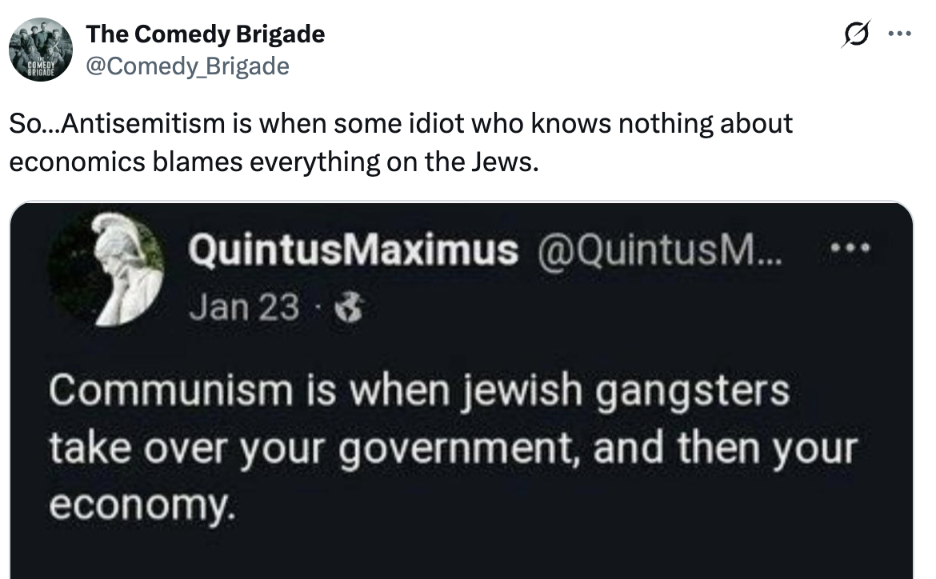 Recently on X, an antisemite posted an image of a scene from an Indiana Jones movie, in which Indiana Jones, labeled “Jews,” is replacing a golden statue labeled “White People” with a sack labeled “Third World.” The image was captioned, “Stay strong Ohio.” The Comedy Brigade account replied, ”Nazis. Putting idiotic words over other people’s art since 1939.”